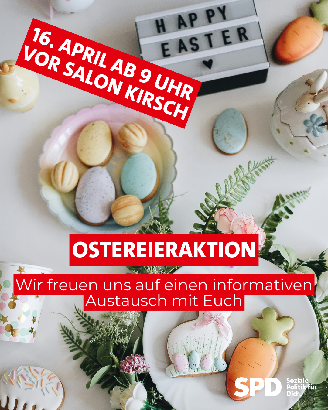Auch in diesem Jahr lädt die SPD/AsF Albersweiler zur traditionellen Ostereierverteilaktion ein. Nicht wie gewohnt am Gründonnerstag, sondern bereits einen Tag früher, am Mittwoch, den 16. April 2025, ab 9 Uhr, werden Mitglieder der Arbeitsgruppe vor dem Salon Kirsch bunte Ostereier an Bürgerinnen und Bürger verschenken.
